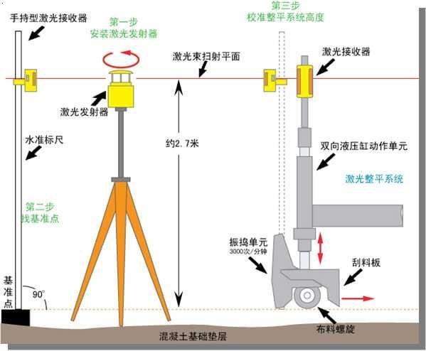 激光整平儀發(fā)射激光信號(hào)→激光接收器接收到激光信號(hào)→激光信號(hào)數(shù)據(jù)傳達(dá)到電腦數(shù)據(jù)處理系統(tǒng)→電腦數(shù)據(jù)處理系統(tǒng)發(fā)送信號(hào)到激光整平機(jī)上的雙向液壓缸→雙向液壓缸執(zhí)行命令(刮板、布料螺旋及振搗器沿空間中的激光平面平行運(yùn)動(dòng))→完成激光整平。